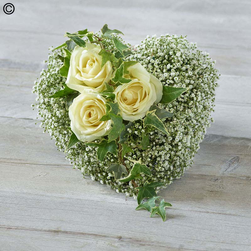 A heart tribute of green and white featuring delicate gypsophila and white roses.